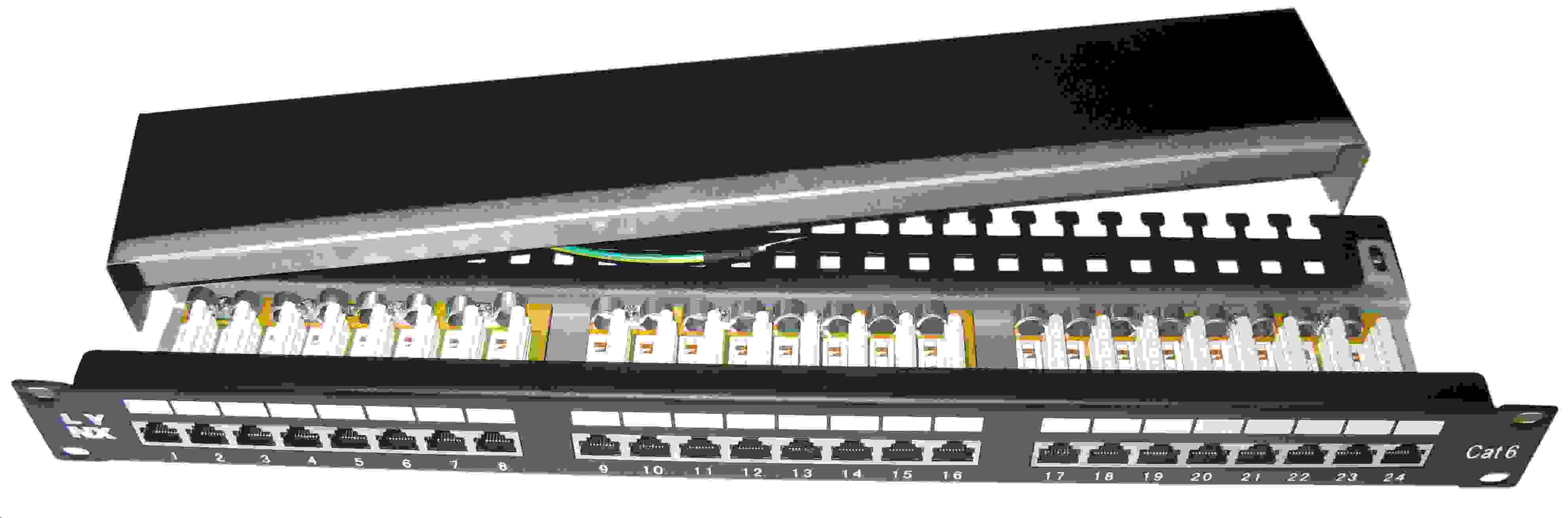 Osazený 19" Patch panel LYNX 24port, STP, Cat6, 30µm, duální svorkovnice, černý Pozlacení: 30µm Svorkovnice: duální (blok110/krone).