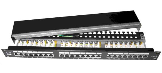 19" Patch panel LYNX 24port, STP, Cat6, 30µm, duální svorkovnice, černý