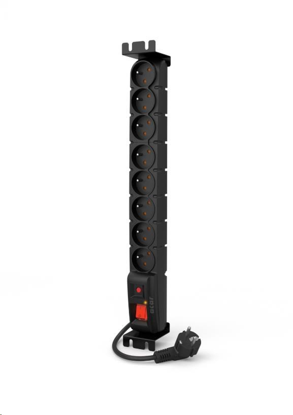 Popis 19" rozvodný panel ACAR 8x230V, vypínač, indikátor napětí, přepěťová ochrana, kabel 5m