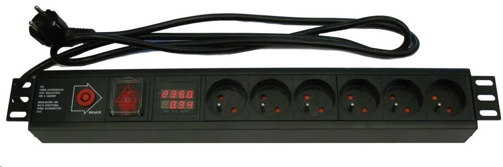 Profesionální 19'' rozvodný panel XtendLan s šesti zásuvkami 230V je ideální pro instalaci do rackových skříní. Díky integrovanému měření spotřeby umožňuje okamžitou indikaci hodnot odběru napětí a proudu. Panel je vybaven vypínačem a nadproudovou ochranou 16A, což zajišťuje bezpečný provoz připojených zařízení. Součástí je napájecí kabel o délce 1,8 m.