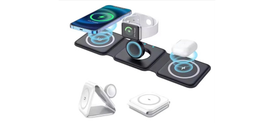 Kvalitní výkonná bezdrátová skládací 3 in 1 s podporou Apple MagSafe, iWatch, AirPods, ale i většiny telefonů, či příslušenství jiných značek podporujících bezdrátové QI nabíjení. Unikátní skládací řešení Vám umožňuje zvolit variantu použítí pouze jako podložku pro jedno zařízení, nebo stojánek případně nabíječku rozložit a nabíjet až tři zařízení. Nabíječku lze opět jednoduše složit do malé kompaktní podoby a v případě potřeby vložit do kapsy a jednoduše vzít kamkoli budete potřebovat.