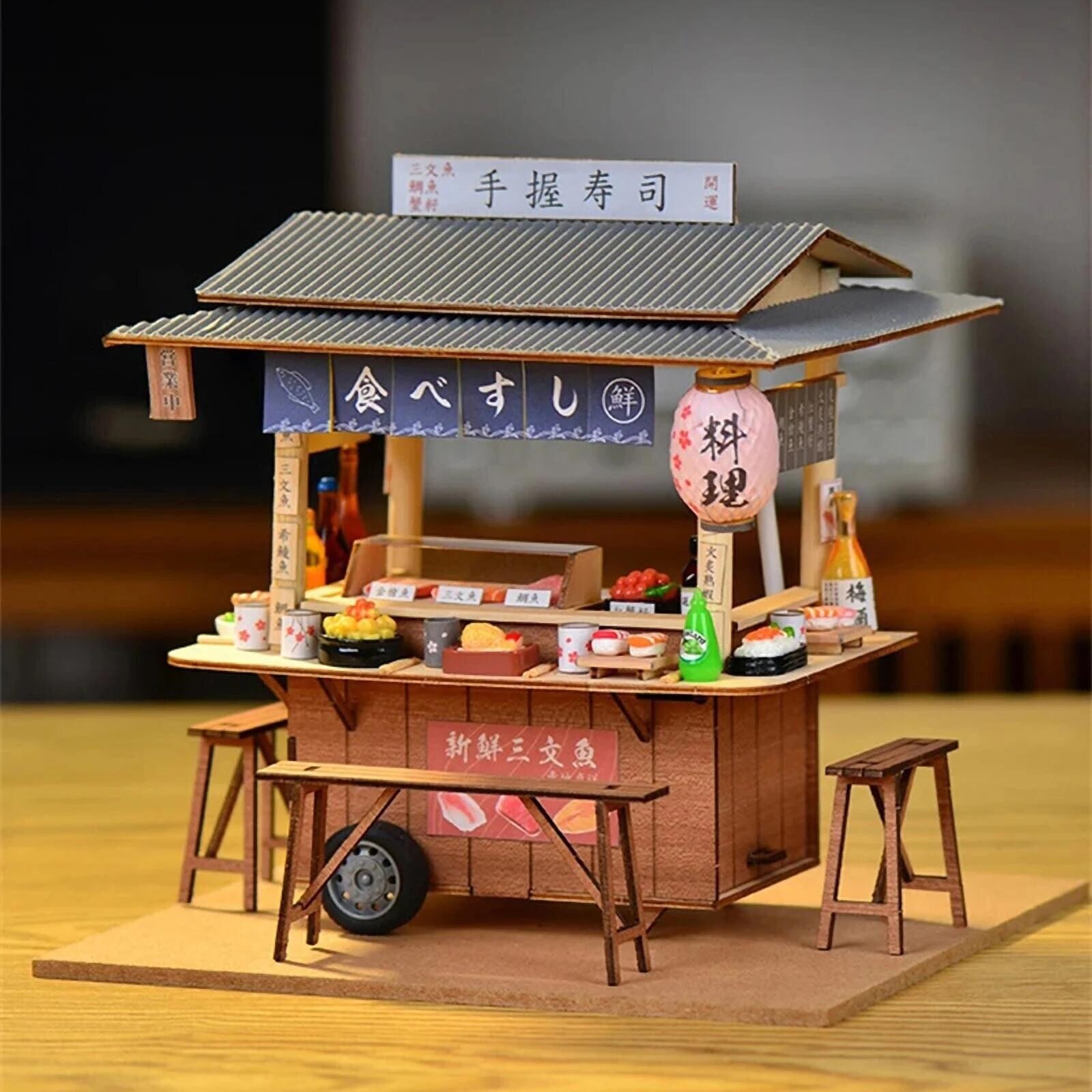 Miniatura domečku Sushi restaurace je originální kreativní stavebnice, která umožňuje postavit si vlastní tematickou restauraci v japonském stylu. Model obsahuje množství drobných detailů, jako jsou nábytek, dekorace a typické prvky sushi restaurace, díky nimž působí realisticky a stylově.