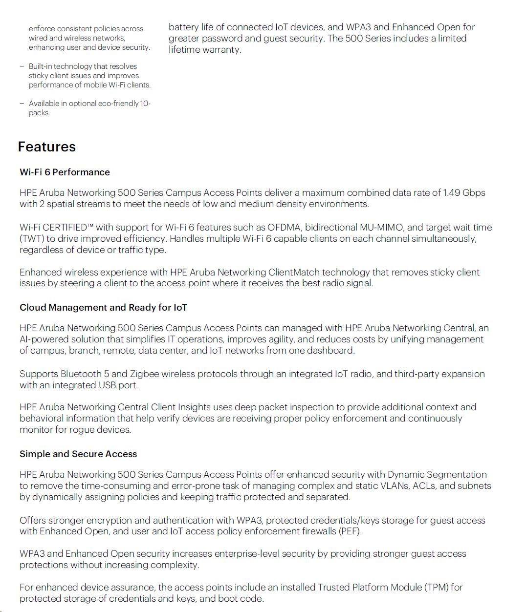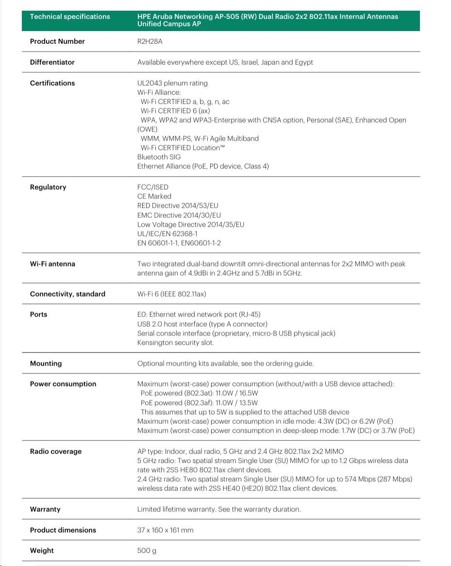 5 x HPE Aruba Networking AP-505 (RW) Dual Radio 2x2 802.11ax Internal Antennas Unified Campus AP ( 5 x R2H28A )