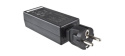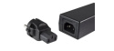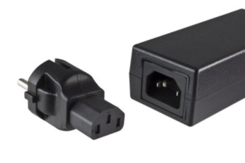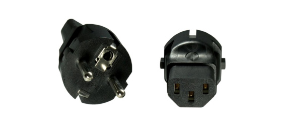 Napájecí adaptér v černém provedení, se vstupním konektorem CEE 7/7 a výstupním IEC C13. Výstupní zásuvka je rovná, německého typu, s ochrannými plíšky po stranách, vhodná pro připojení vidlice, která je vybavena zemnícími plíšky po stranách.