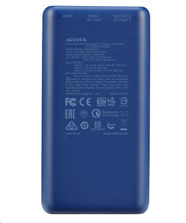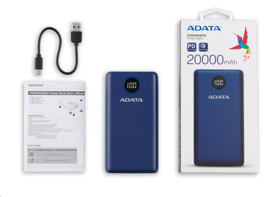 Powerbanka ADATA P20000QCD je dodávána s USB-C kabelem a návodem k použití. Je na ni poskytována 1letá záruka.