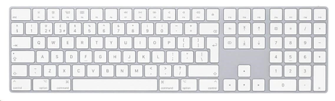 Magic Keyboard s číselnou klávesnicí nabízí rozšířené rozvržení včetně kláves pro rychlé posouvání v dokumentech a kláves se šipkami plné velikosti pro hraní her. Díky nůžkovému mechanismu pod každou klávesou, který zajišťuje větší stabilitu, optimalizovanému pohybu kláves a nižšímu profilu je psaní mimořádně pohodlné a přesné. Číselná klávesnice se dokonale hodí pro práci s tabulkami a finančními aplikacemi. A zabudovaná nabíjecí baterie má neuvěřitelnou výdrž – na jedno nabití vydrží klávesnice fungovat déle než měsíc.