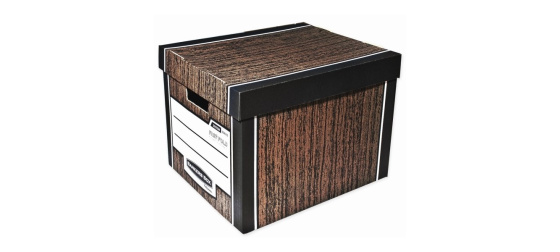 Série Bankers Box WOODGRAIN. Výhodou je snadné skládání - systém FastFold® umožňuje složení během několika vteřin. Vyrobena z tlusté vlnité lepenky s dvojitým systémem bočních stěn, otvory na bocích pro snadné přenášení. Velké etikety k popisu obsahu na čelní straně. Odklápěcí víko. Vnější rozměry (šxvxh): 340 x 295 x 405 mm, vnitřní rozměry (šxvxh): 325 x 285 x 385 mm. Barva hnědá / imitace dřeva. Baleno po 2 ks. Dodáváme v rozloženém stavu. .. Fellowes, Inc., 1789 Norwood Avenue Itasca, IL 60143-1095 USA, inquiries@fellowes.com