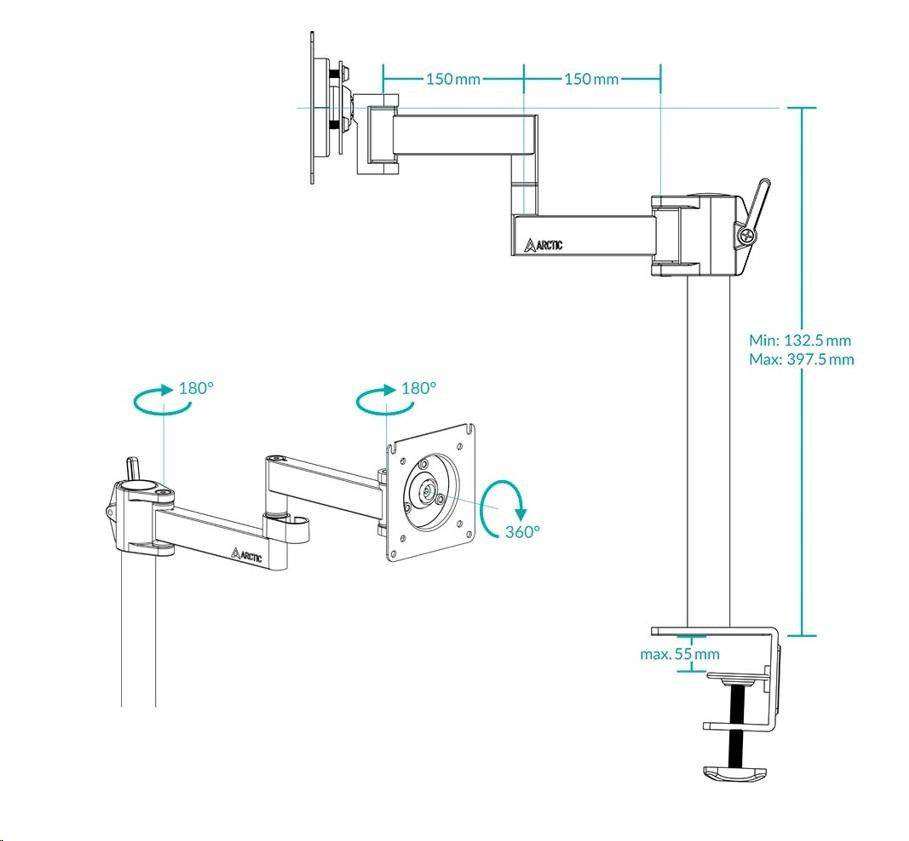 - SIMPLE AND QUICK ASSEMBLY - Thanks to the table clamp, the monitor arm can be placed freely and easily on the edge of the table. The arm is completely pre-assembled and is simply placed on the rod. Assembly or later repositioning is therefore child's play and can be done quickly.