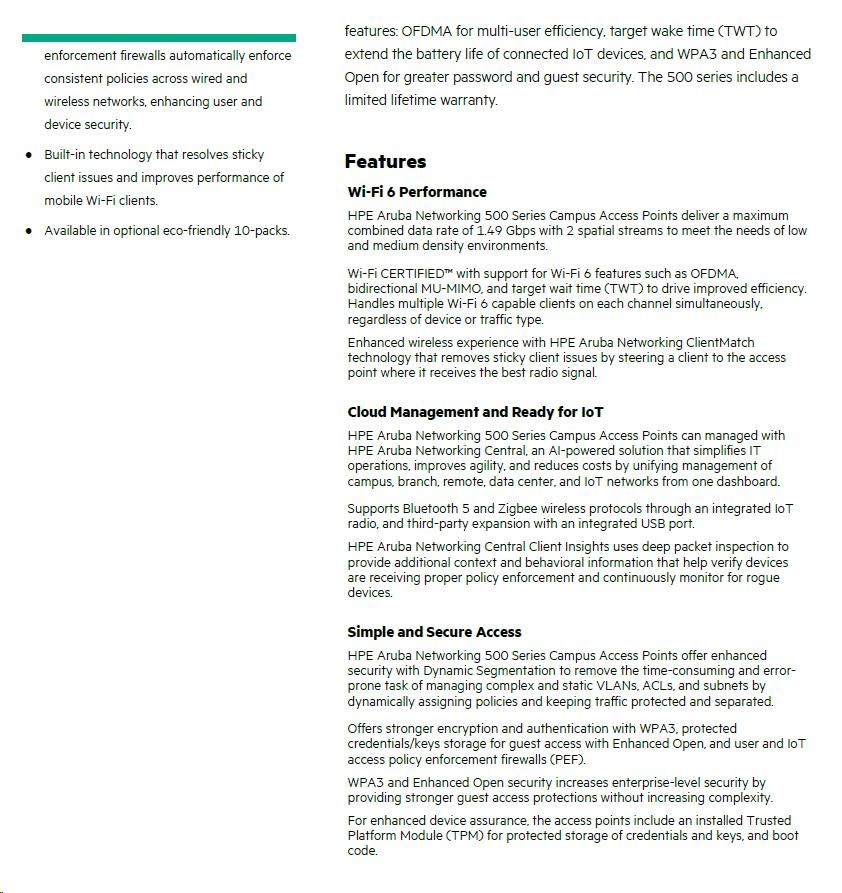 The HPE Aruba 500 Series delivers affordable, high-performance Wi-Fi 6 for schools, midsize offices, and retailers. With up to 1.49 Gbps real-world speed, it supports mobile, IoT, and demanding user needs.