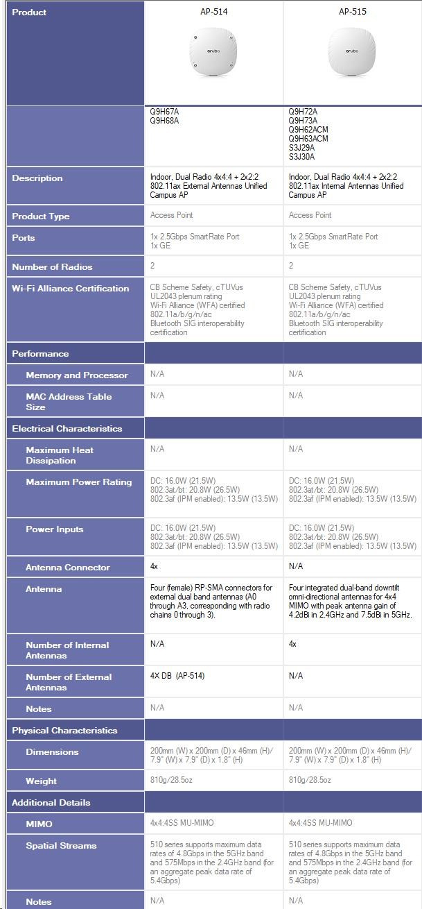 HPE Aruba Networking AP-515 (RW)AP-515 (RW) Dual Radio 4x4:4 + 2x2:2 802.11ax Internal Antennas Unified Campus AP Q9H62A
