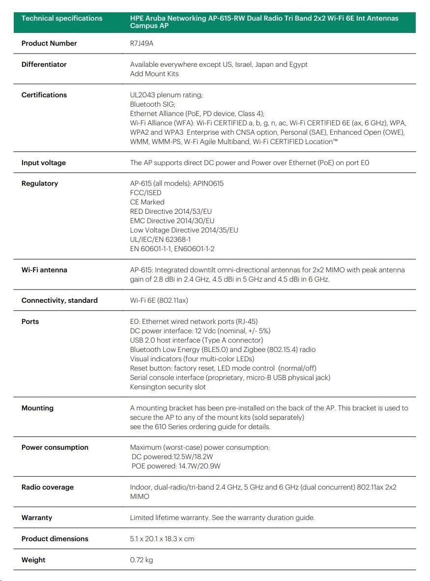 Aruba AP-615 (RW) Dual-radio Tri-band 2x2:2 802.11ax Wi-Fi 6E Internal Antennas Campus AP