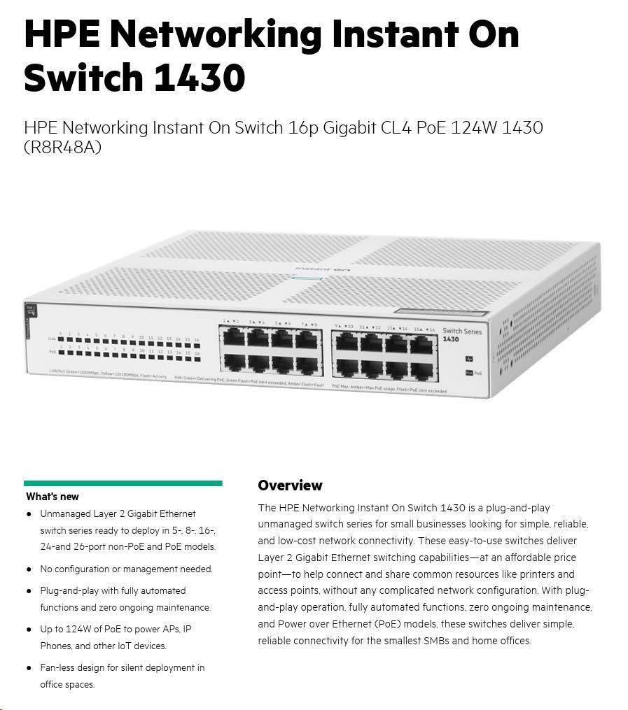 | HPE Networking Instant On Switch 16p Gigabit CL4 PoE 124W 1430 (R8R48A) | ||