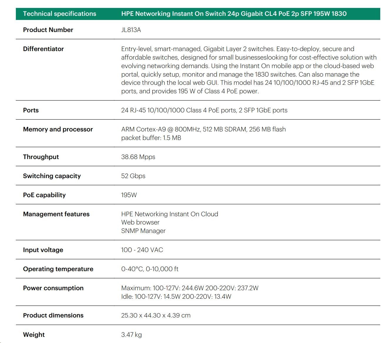HPE Networking Instant On Switch 24p Gigabit CL4 PoE 2p SFP 195W 1830 (JL813A)