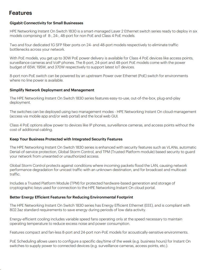 Popis HPE Networking Instant On Switch 24p Gigabit CL4 PoE 2p SFP 195W 1830 (JL813A)