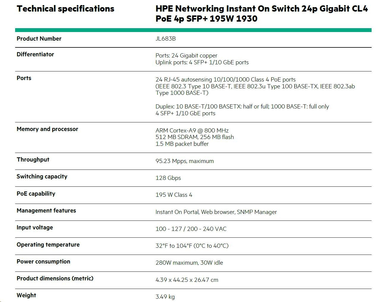 HPE Networking Instant On Switch 24p Gigabit CL4 PoE 4p SFP+ 195W 1930 (JL683B)