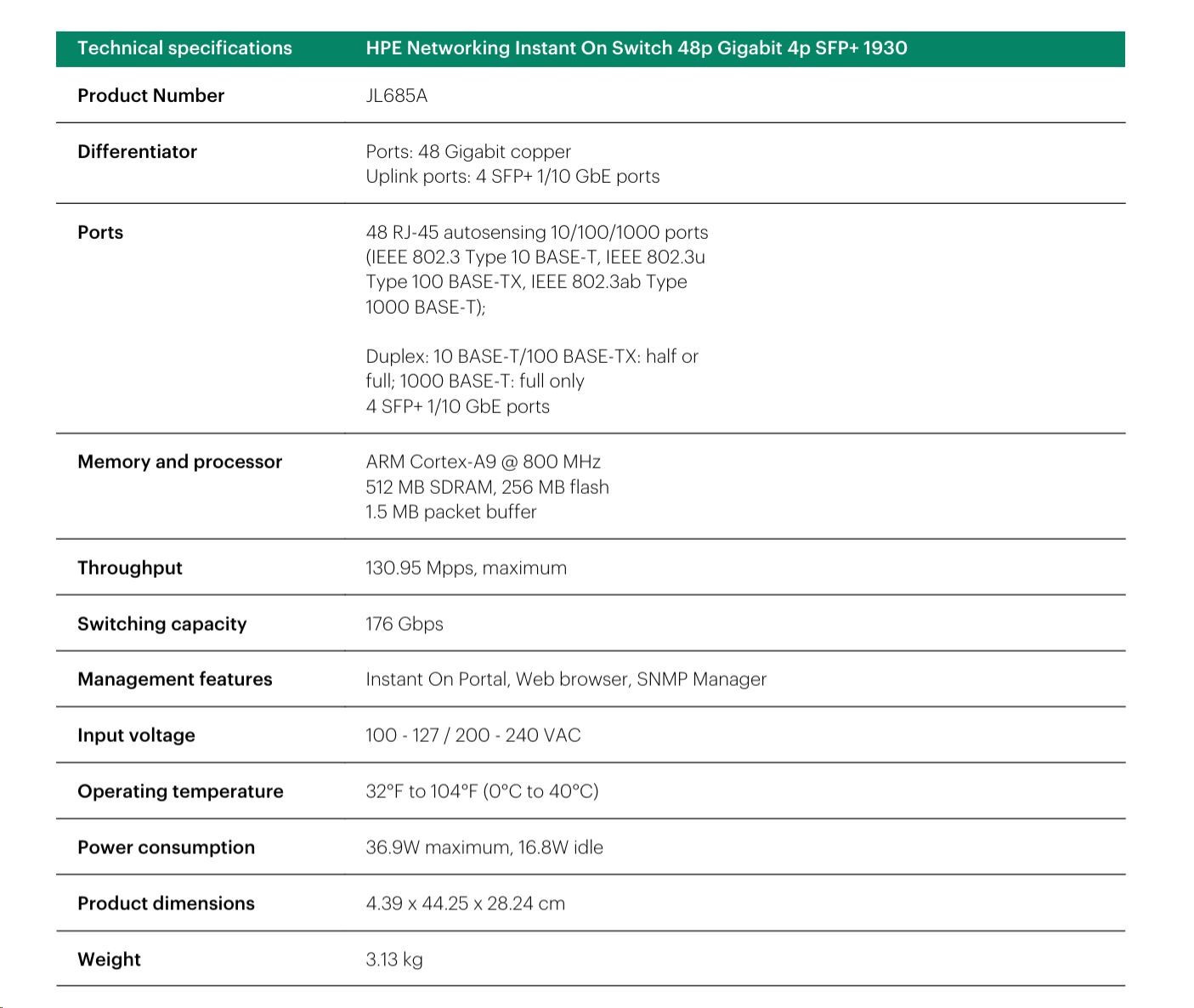 | Transceivers | Aruba Instant On 1G SFP LC SX 500m OM2 MMF Transceiver (R9D16A ) Aruba 1G SFP LC LX 10km SMF Transceiver (J4859D) Aruba Instant On 1G SFP RJ45 T 100m Cat5e Transceiver (R9D17A) Aruba Instant On 10G SFP+ LC SR 300m OM3 MMF Transceiver (R9D18A) Aruba 10G SFP+ LC LR 10km SMF Transceiver (J9151E) | |