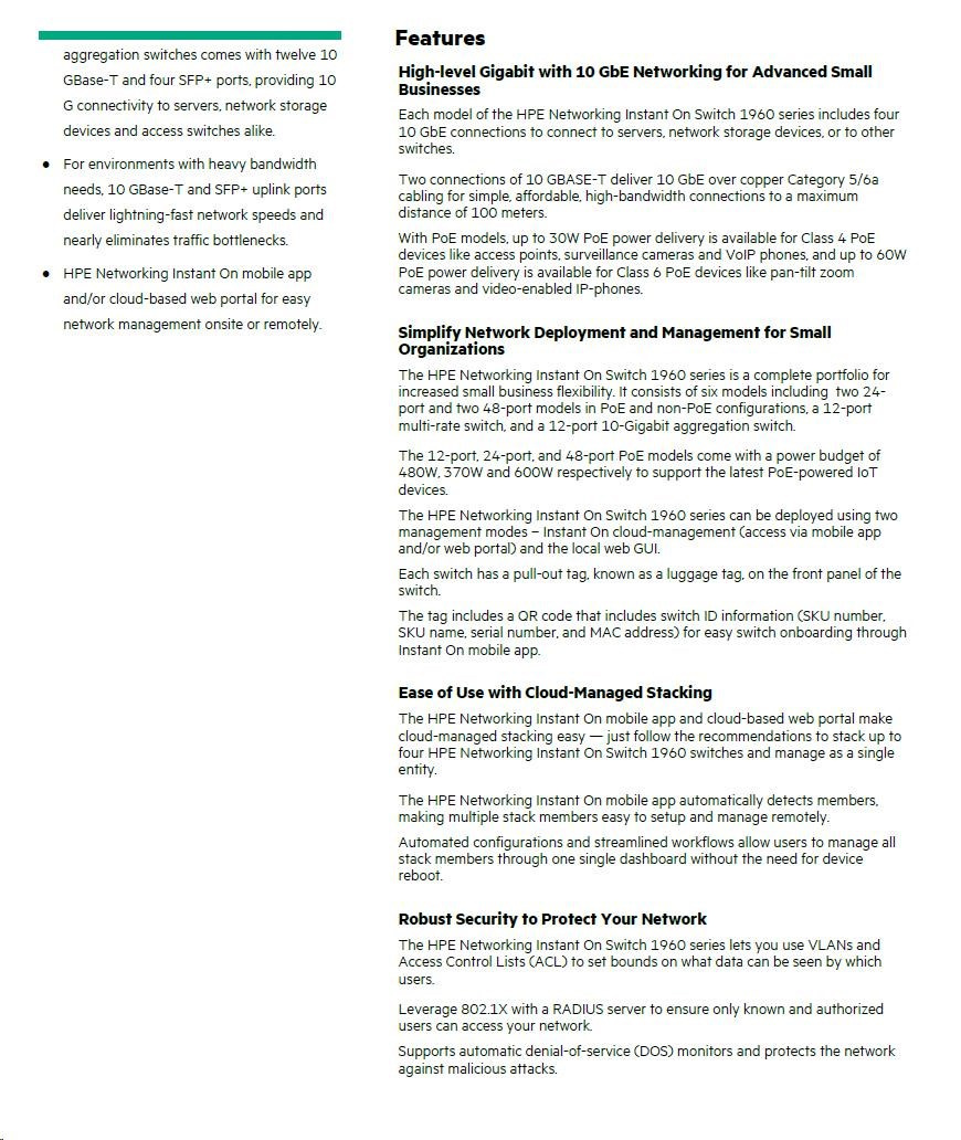 1960 Provedení:Desktop, Rack mounted 19"; Funkce:QoS (Quality of service), VLAN (virtual local area network), DHCP snooping, Stohovatelnost, L2, Web management/Smart switch, VPN; Technologie:Gigabit Ethernet + 10 GbE porty; Počet portů LAN:48; Počet portů LAN:48; Přenosová rychlost LAN (Mb/s):131; Přenosová rychlost LAN (Mb/s):131; Počet SFP portů:4.Více