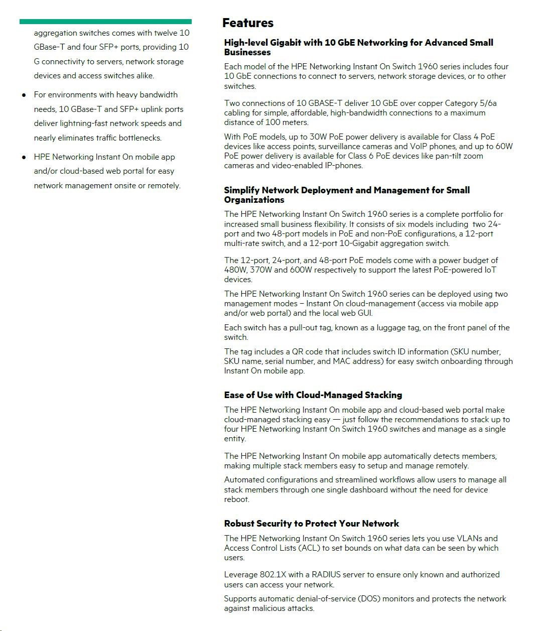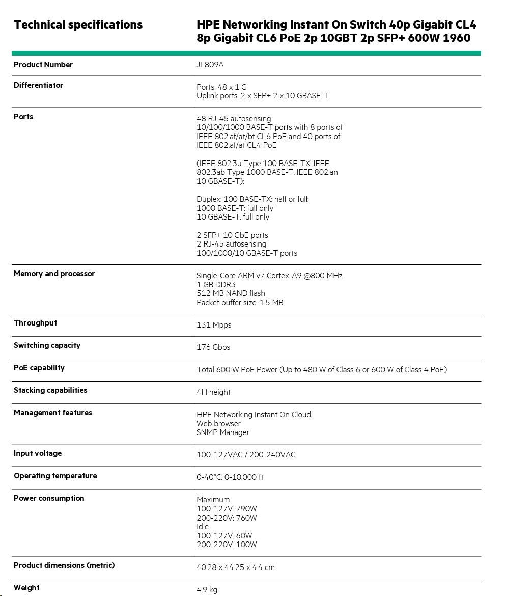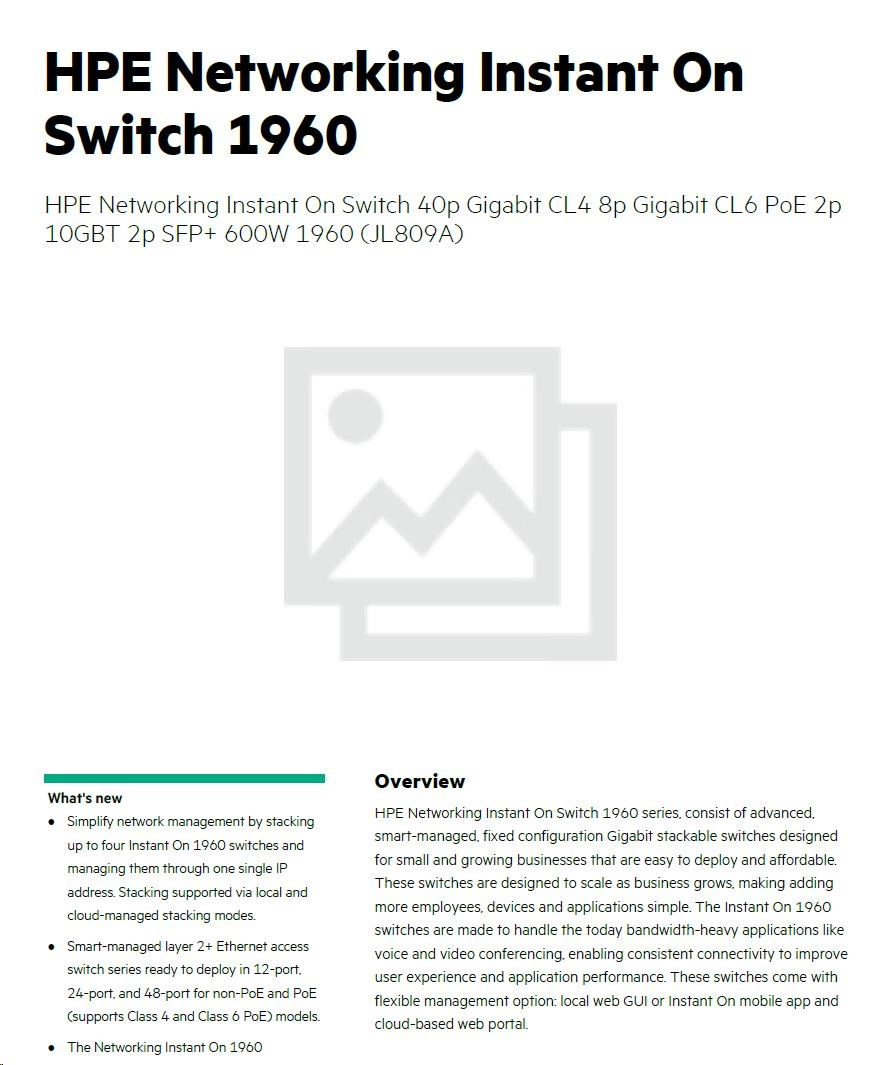 Popis HPE Networking Instant On Switch 40p Gigabit CL4 8p Gigabit CL6 PoE 2p 10GBT 2p SFP+ 600W 1960 (JL809A)