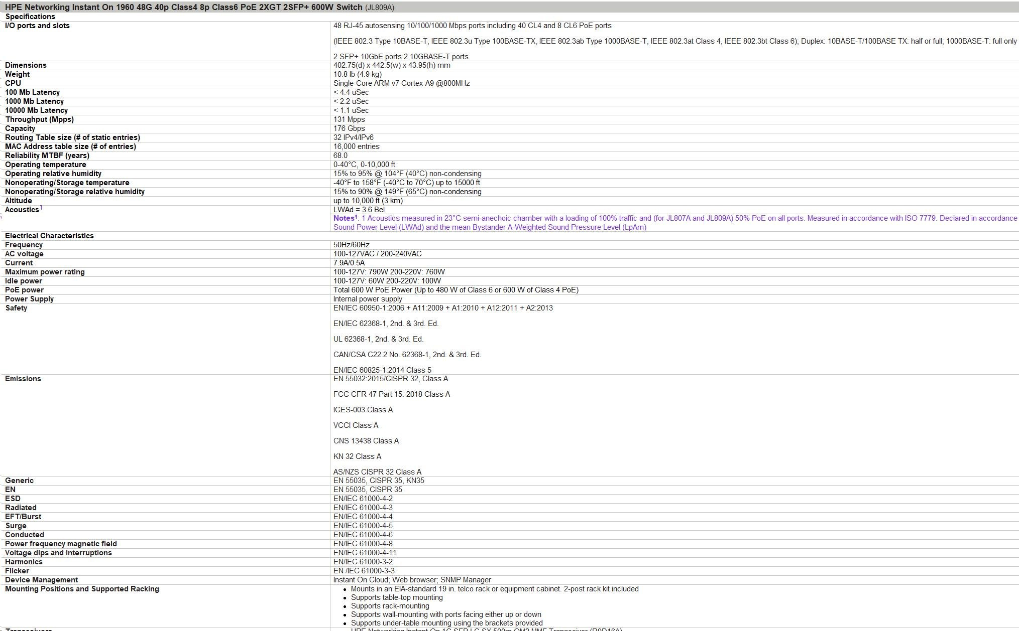 Notes1: 1 Acoustics measured in 23°C semi-anechoic chamber with a loading of 100% traffic and (for JL807A and JL809A) 50% PoE on all ports. Measured in accordance with ISO 7779. Declared in accordance with ECMA-109:2010. Values presented are the Declared A-Weighted Sound Power Level (LWAd) and the mean Bystander A-Weighted Sound Pressure Level (LpAm)