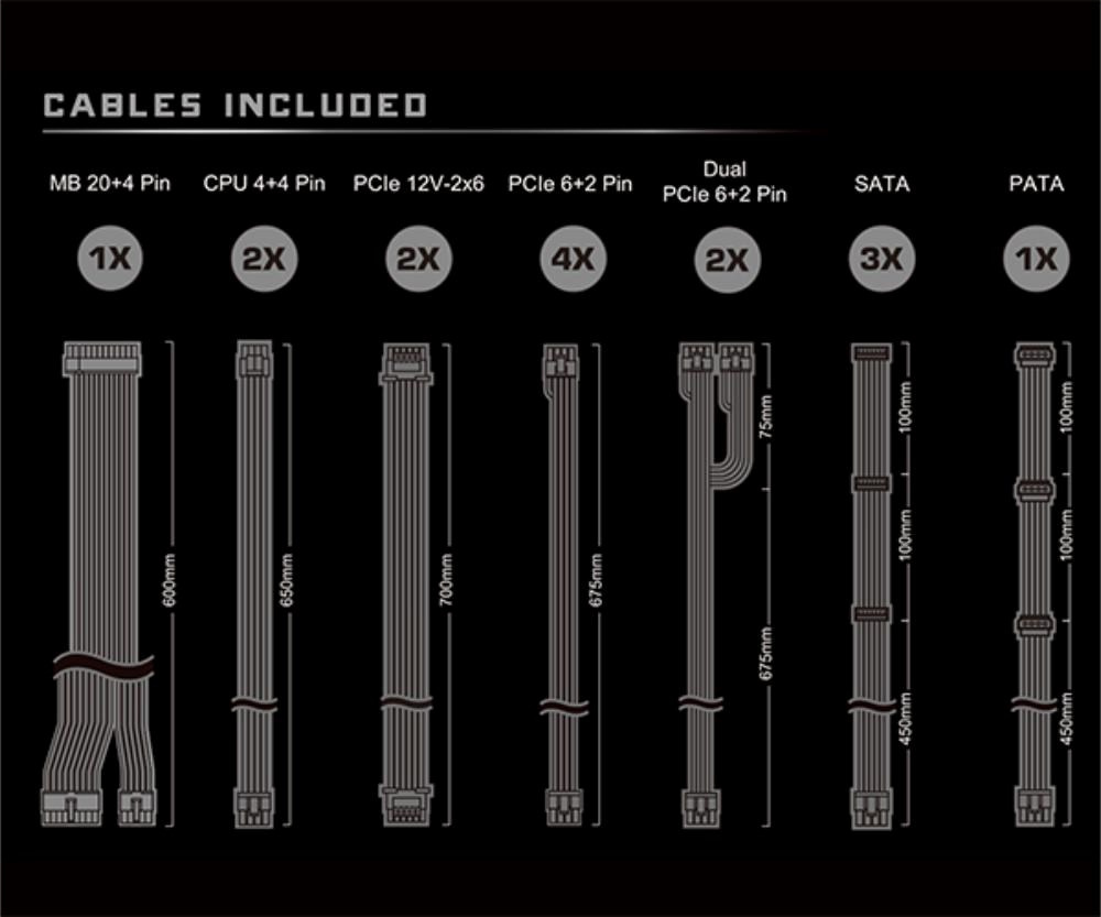 | Dueal PCIe 6+2 Pin Konektor | 2x / 2x (675 + 75 mm) |