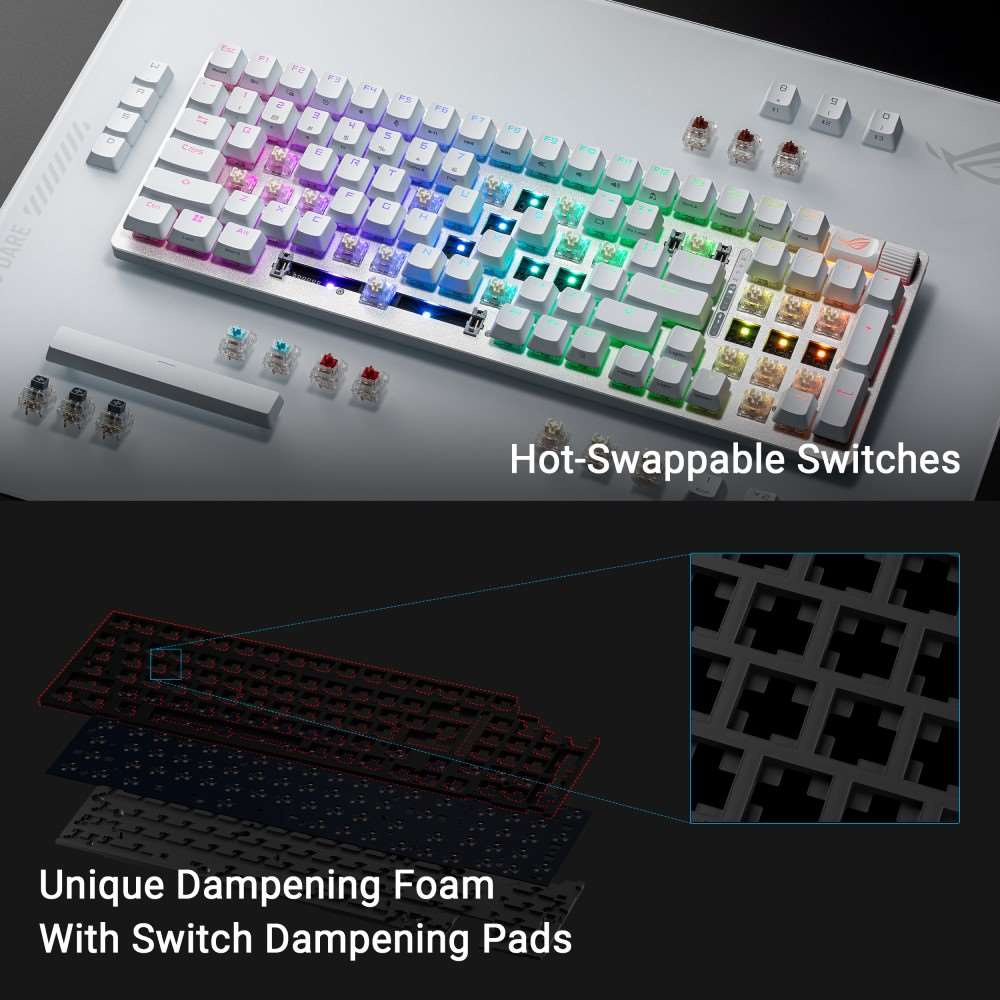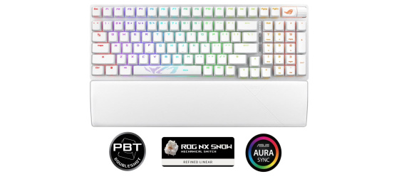 • Připojení ve třech režimech: Připojte se pomocí Bluetooth® (až tři zařízení), 2,4 GHz s bezdrátovou technologií ROG SpeedNova (až 1500 hodin výdrže baterie) nebo kabelového USB přepínače vyměnitelné za chodu: Předem namazané lineární přepínače NX Snow se stěnou konstrukce představce, která zvyšuje stabilitu a zabraňuje vnikání prachu
