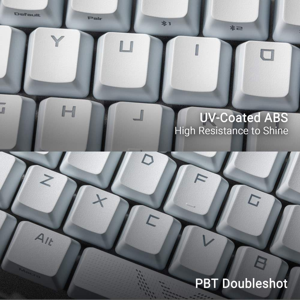 • Vylepšené možnosti psaní: Předem namazané stabilizátory klávesnice produkují menší tření pro hladší stisk kláves a stabilitu pro delší klávesy; odolné krytky kláves ROG PBT doubleshot nebo krytky kláves ABS s UV vrstvou nabízejí prvotřídní pocit a odolnost proti lesku