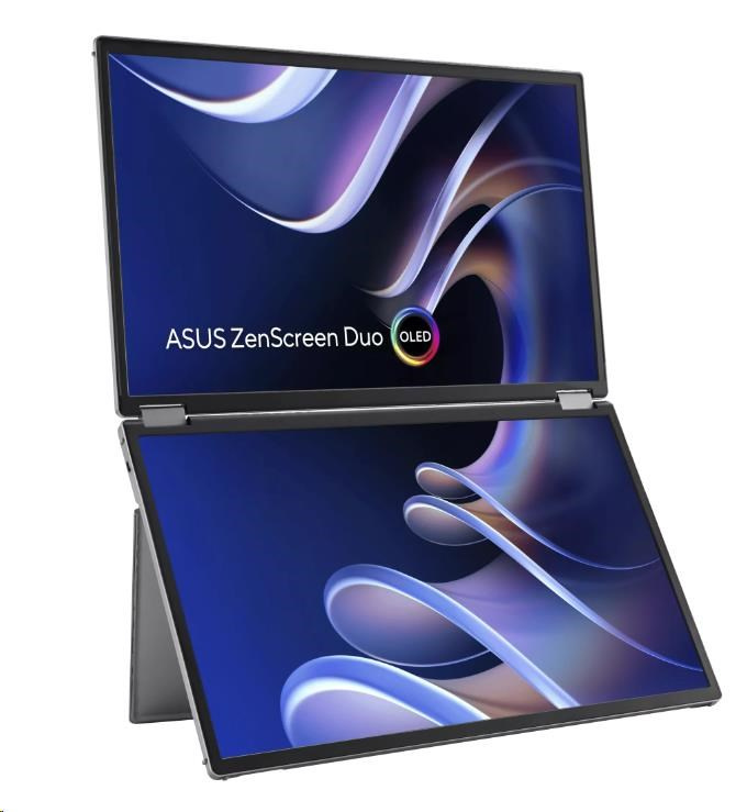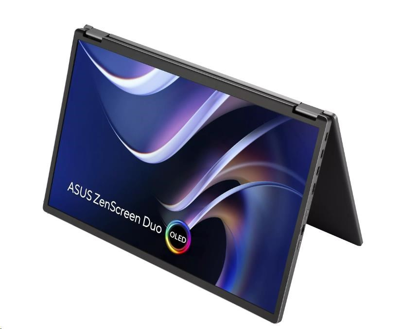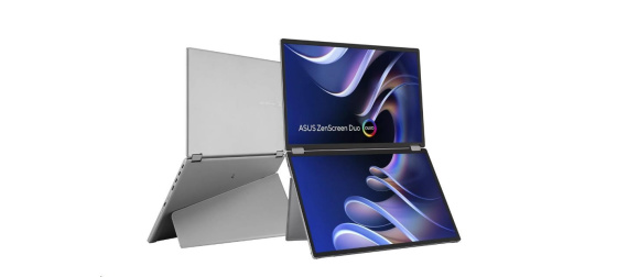 Dva 14palcové panely OLED s rozlišením 1920 × 1200 FHD, poměrem stran 16:10, technologií DisplayHDR™ 400 True Black, 100% DCI-P3, Delta<2, dvěma USB typu C®, mini-HDMI®, stojanem a standardním otvorem pro stativ.