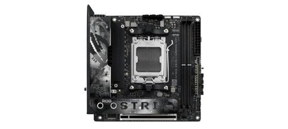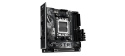 AMD X870 Mini-ITX motherboard with 10+2+1 power stages, Dynamic OC Switcher, Core Flex, DDR5 slots with AEMP, WiFi 7 with ASUS WiFi Q-Antenna, two M.2 slots, PCIe® 5.0 x16 SafeSlot with PCIe® Slot Q-Release Slim and full support for next-gen graphics cards, two USB4® ports, ROG Strix Hive II, AI Overclocking, AI Cooling II, AI Networking II, and Aura Sync RGB lighting.