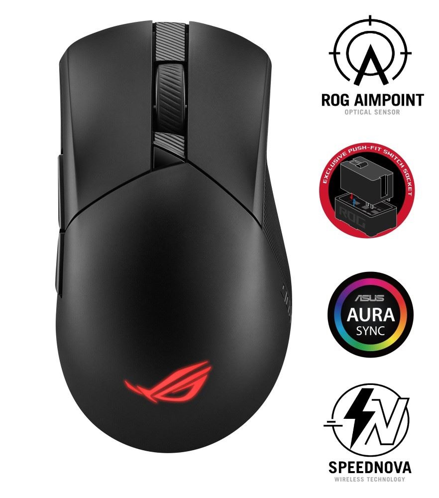 - Push-Fit Switch Socket II: Vyměnitelný design spínače pro snadné přizpůsobení; Gladius III Wireless AimPoint obsahuje mikrospínače ROG a je kompatibilní s dalšími 3pinovými mechanickými a 5pinovými optickými mikrospínači
