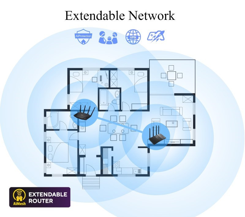 - AiMesh – možnost rozšíření domácí sítě bez výpadků signálu