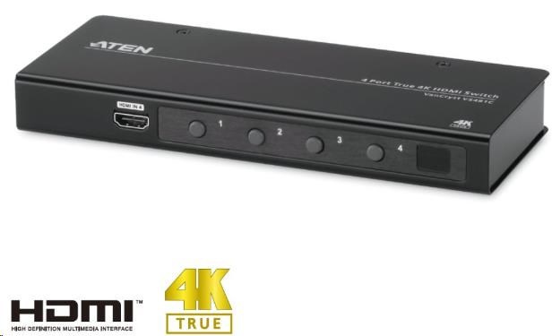 VS481C ATEN 4 port HDMI switch 4 PC - 1 HDMI VS481C True 4K@60Hz video HDMI Switch 4 ->1 VS481C 4 Portový HDMI přepínač umožní jednoduše a rychle sdílet HDMI zobrazovací jednotku (TV, projektor, monitor) s až 4 zdroji vstupních signálů (DVD, TV, BlueRay, Satelit …). Zařízení umožňuje přepnutí na požadovaný zdroj signálu pomocí dálkového ovládání, tlačítka na předním panelu nebo přes port RS-232. Podpora až 4K@60Hz rozlišení. - Umožní připojit až 4 vstupy na jedno zobrazovací zařízeni - Přepínání tlačítkem, dálkovým ovládáním, přes port RS-232 - Podpora šířky pásma 600 Mhz, 4kx2k@60Hz video - Datový tok18 Gbps (6 Gbps Per Lane) - Kompatibilní HDMI 2.0 (3D, Deep Color, 4K); HDCP 2.2, Consumer Electronics Control (CEC) - Podporuje max.rozlišení obrazu: 4096 x 2160 / 3840 x 2160 @ 60Hz (4:4:4) - Automatický mód přepínání pro automatický výběr portu - Consumer Electronics Control (CEC) podpora - Podpora Dolby True HD a DTS HD Master Audio - Vestavěný port RS-232 pro vzdálené ovládání systémy high-end - Instant switching pro plynulý přechod mezi zdroji HDMI videa - Podpora prodloužení IR signálu pomocí IR prodlužovacího kabelu (není součástí balení) - LED indikace jednotlivých stavů portů - Podpora HDR10+. , ,