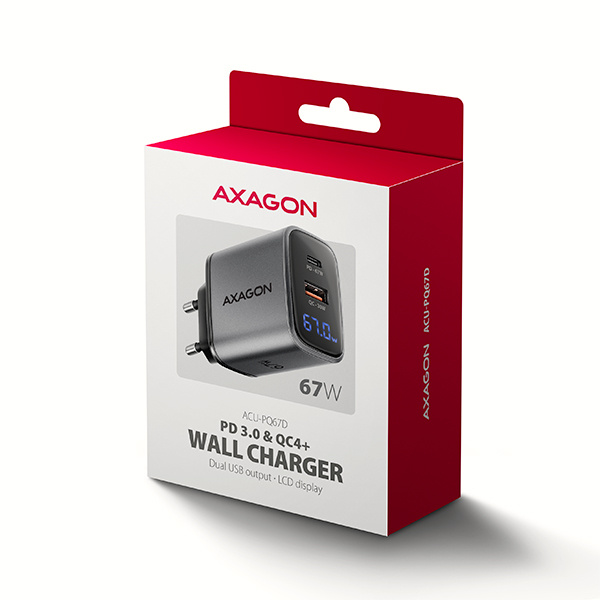 Cestovní nabíječka do sítě AXAGON ACU-PQ67D GaN umožňuje rychlé nabíjení až dvou mobilních zařízení současně. Díky celkovému výkonu 67W dokáže nabíječka dobíjet notebooky, tablety, telefony a další mobilní zařízení nejvyšší možnou rychlostí. Adaptér nabízí nejen standardní USB-A konektor, ale také oboustranný USB-C konektor. Přehledný LCD displej zobrazuje aktuální výkon nabíjení.