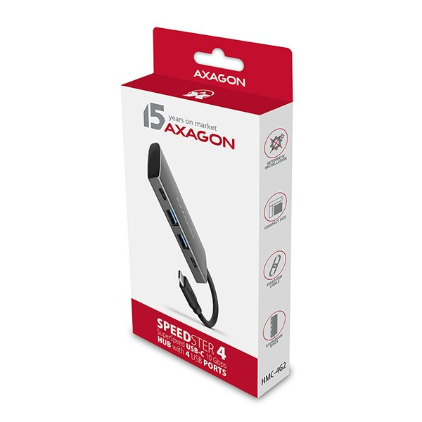 Vysokorychlostní USB-C 3.2 Gen 2 hub AXAGON HMC-4G2 SPEEDSTER 4 rozšíří Váš notebook, počítač nebo telefon o čtveřici portů. Přes oboustranný USB-C konektor snadno a rychle připojíte k počítači až čtyři USB zařízení současně.
