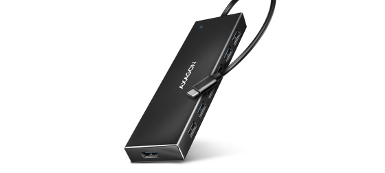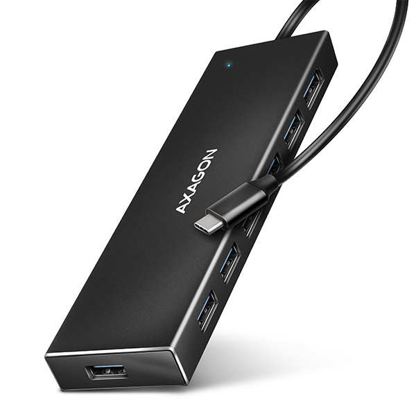 Tenký USB-C 3.2 Gen 1 (USB 3.0) hub AXAGON HUE-F7C s USB kabelem dlouhým 1.2m snadno a rychle připojí k notebooku až sedm USB zařízení současně. Standard USB 3.2 Gen 1 umožní přenosovou rychlost až 5Gb/s.