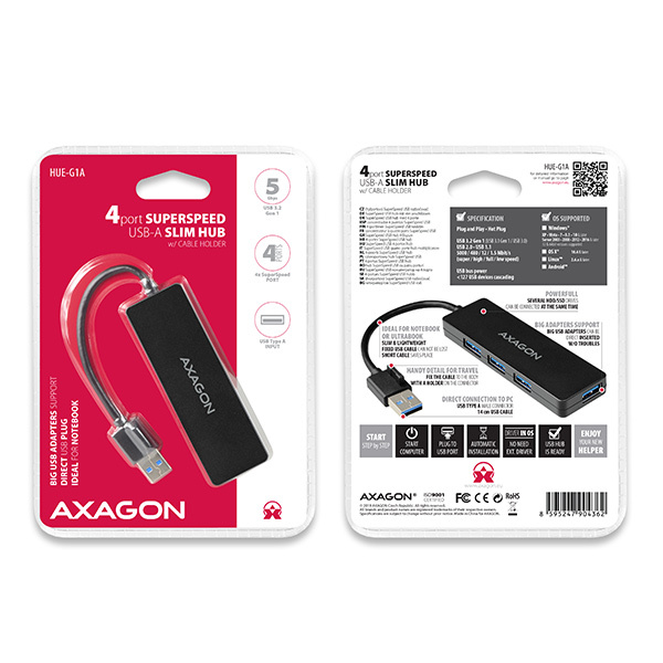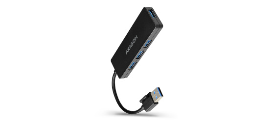 4-portový USB 3.2 Gen 1 hub AXAGON HUE-G1A je malý a tenký rozbočovač vhodný nejen na cesty. Elegantní plastové tělo s polo-matným, jemně strukturovaným povrchem, na kterém nezůstávají otisky. Snadno a rychle připojí k laptopu nebo počítači až čtyři USB zařízení současně.