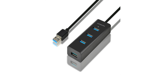4-portový USB 3.0 hub AXAGON HUE-S2BL s USB kabelem dlouhým 1.2m, možností externího napájení a podporou rychlonabíjení na všech portech. Lehký malý rozbočovač s elegantním matným plastovým tělem připojí snadno a rychle k počítači až čtyři USB zařízení současně. Napevno uchycený 1.2 m dlouhý USB kabel je vhodný pro použití se stolním počítačem.