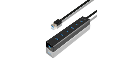 7-portový USB 3.0 hub AXAGON HUE-SA7BP ALU CHARGING s vlastním napájením a podporou rychlonabíjení na všech USB portech. Kompaktní rozbočovač s odolným hliníkovým pláštěm připojí k počítači až sedm USB zařízení současně. Napevno uchycený USB kabel dostatečné délky 40 cm ideální pro použití s notebooky.