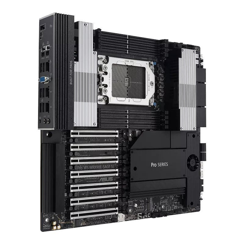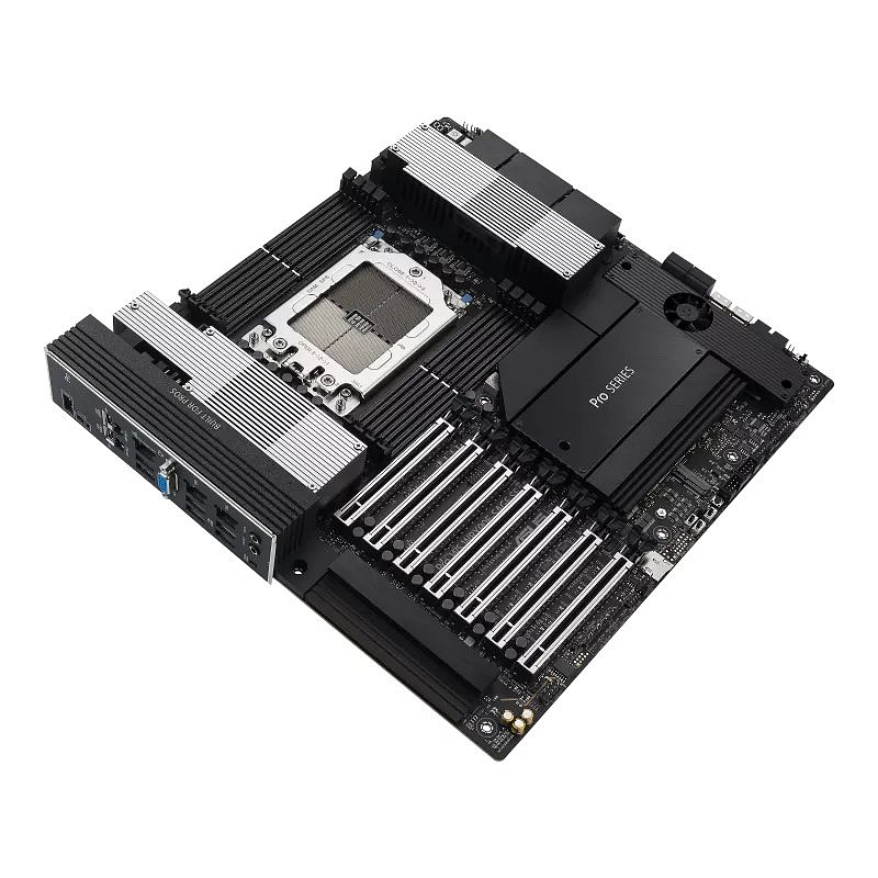 AMD sTR5 EEB workstation motherboard, 7 PCIe 5.0 x16 slots, multi-GPU support, robust 32+3+3+3 power-stage design, CPU and memory overclocking ready, 4 PCIe 5.0 M.2 slots, dual 10 Gb LAN, PCIe Q-Release Slim