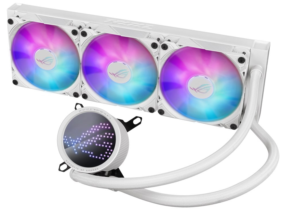 ROG Ryuo III 360 white edition all-in-one liquid CPU cooler with Asetek 8th gen pump solution, Anime Matrix™ LED Display and ROG ARGB cooling fans