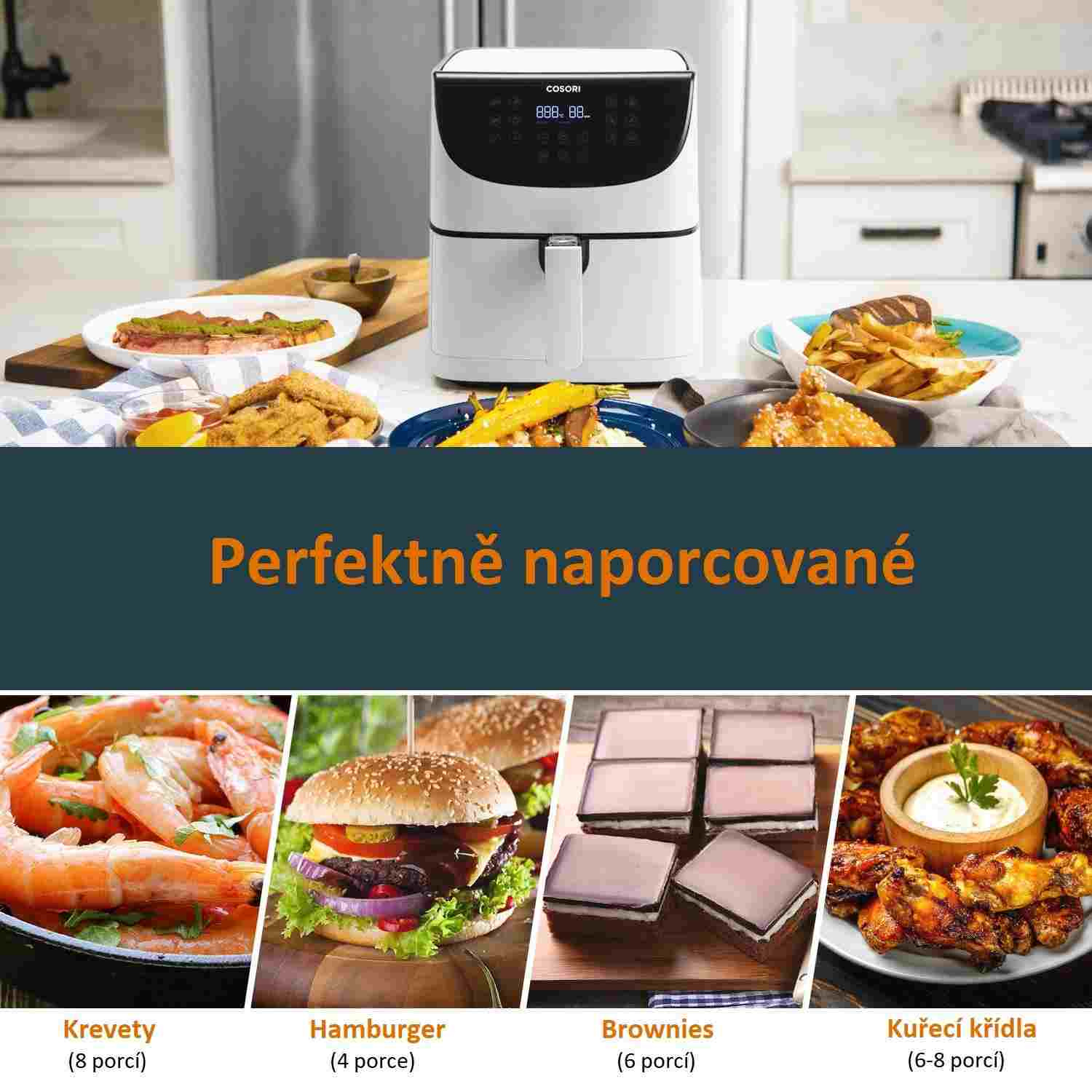 S horkovzdušnou fritézou COSORI CP158-AF PREMIUM si můžete užít vaše oblíbená smažená jídla bez výčitek, protože na rozdíl od běžného smažení nebo fritování je možné v ní připravovat jídla za použití velice malého množství oleje a nebo vůbec žádného. Kombinace cirkulujícího horkého vzduchu, dokonalé teploty vaření a chytrých programů zajistí, že hranolky budou vždy krásně křupavé a kuřecí stehna šťavnatá. Ať už je vaše jídlo čerstvé nebo mražené, stisknutím tlačítka můžete horkým vzduchem smažit kuřecí křídla, kuřecí prsa, sladké brambory, steaky, čerstvé hranolky a mnoho dalšího. Až budete mít hotovo, čištění bude stejně snadné díky nepřilnavému koši, který lze mýt v myčce. Díky veliké nádobě s objemem 5,5l navíc dokážete rychle navařit i pro větší rodinu nebo skupinu hostů.