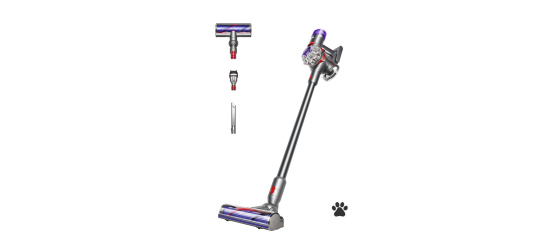Tyčový vysavač Dyson V8 s množstvím vyměnitelných nástavců na úklid podlahy, stropu, či sedací soupravy je poháněný novým digitálním motorem Dyson V8. Díky vysoké sací síle vysaje špínu a zvířecí chlupy takřka z každého povrchu, zákoutí a úzkých mezer. Kvalitní baterie vydrží až 40 minutový provoz, přičemž její nabití trvá 3,5 hodiny. Součástí vysavače je také zásobník na nečistoty o objemu 0.54 L, který lze snadno vyprázdnit pouhým stisknutím jednoho tlačítka.