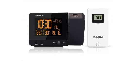 Meteorologická stanice se špičkovým inverzním barevným VA displejem s časem řízeným rádiovým signálem DCF-77, budíkem, měřením vnitřní teploty, bezdrátovým čidlem pro měření vnější teploty a projekcí času a vnitřní / venkovní teploty inverzní barevný VA displej o rozměrech 63 x 42 mm s možností stálého osvětlení při napájení síťovým adaptérem, nebo krátkodobým osvětlením na 15 s při napájení bateriemi 3 stupně jasu osvětlení displeje, možnost vypnutí osvětlení displeje s možností krátkodobého osvětlení na 15 s (při napájení síťovým adaptérem) lze nastavit až 70 barev displeje, nebo režim automatického plynulého střídání barev možnost rychlé volby 8 barev osvětlení displeje velikost číslic na displeji – čas 22 mm, datum, vnitřní a vnější teplota 10 mm, zkratka názvu dne 7 mm čas a datum řízené signálem DCF-77 s možností manuálního nastavení ikona příjmu signálu DCF-77 zkratka názvu dne 12ti, nebo 24 hodinový formát zobrazení času možnost nastavení časového pásma od -1 do +2 hodin budík s 2 budícími časy s funkcí opakovaného buzení (Snooze) po 5 minutách budící signál - 20 sekund 1 pípnutí za sekundu, 20 sekund 2 pípnutí za sekundu, 20 sekund 4 pípnutí za sekundu a poté stálé pípání střídavá projekce času a vnitřní a vnější teploty (teploty se střídají co 5 s) s možností otočení obrazu o 180°, možnost sklopení tubusu projektoru o 90° dopředu a dozadu barva projekce červená stálá projekce při napájení síťovým adaptérem s možností vypnutí 6 animovaných ikon předpovědi počasí (slunečno, polojasno, oblačno, srážky, silný déšť a sněžení) na základě sledování barometrického tlaku vestavěným barometrickým čidlem možnost nastavení výchozí ikony předpovědi počasí zobrazení hodnot vnitřní a vnější teploty paměť na maximální a minimální naměřené hodnoty teploty s automatickým mazáním v 0:00 hodin šipky tendence vývoje barometrického tlaku, vnitřní a vnější teploty indikace námrazy vnější teploty v rozsahu od -1°C do +3°C ikonou na displeji zobrazení teploty ve °C, nebo °F možnost použití až 3 bezdrátových čidel GARNI 029 (jedno čidlo GARNI 029 je součástí dodávky) bezdrátový přenos hodnot vnější teploty na frekvenci 433 MHz ikona příjmu signálu bezdrátového čidla USB port pro nabíjení mobilních zařízení (pouze při napájení hlavní jednotky síťovým adaptérem), maximální nabíjecí proud 1 000 mA ikony slabých baterií napájení síťovým adaptérem, nebo bateriemi možnost postavení barva černá Bezdrátové čidlo GARNI 029 vlhkosti odolné displej o rozměrech xxxxxx mm velikost číslic na displeji: teplota xxxxxx mm měření teploty 3 kanály maximální RF výkon 10 dBm (10 mW) možnost postavení a zavěšení barva bílá Obsah balení: 1 x hlavní jednotka GARNI 365 Arcus 1 x bezdrátové čidlo GARNI 029 1 x síťový adaptér český, slovenský, německý, anglický, italský, polský a maďarský návod.