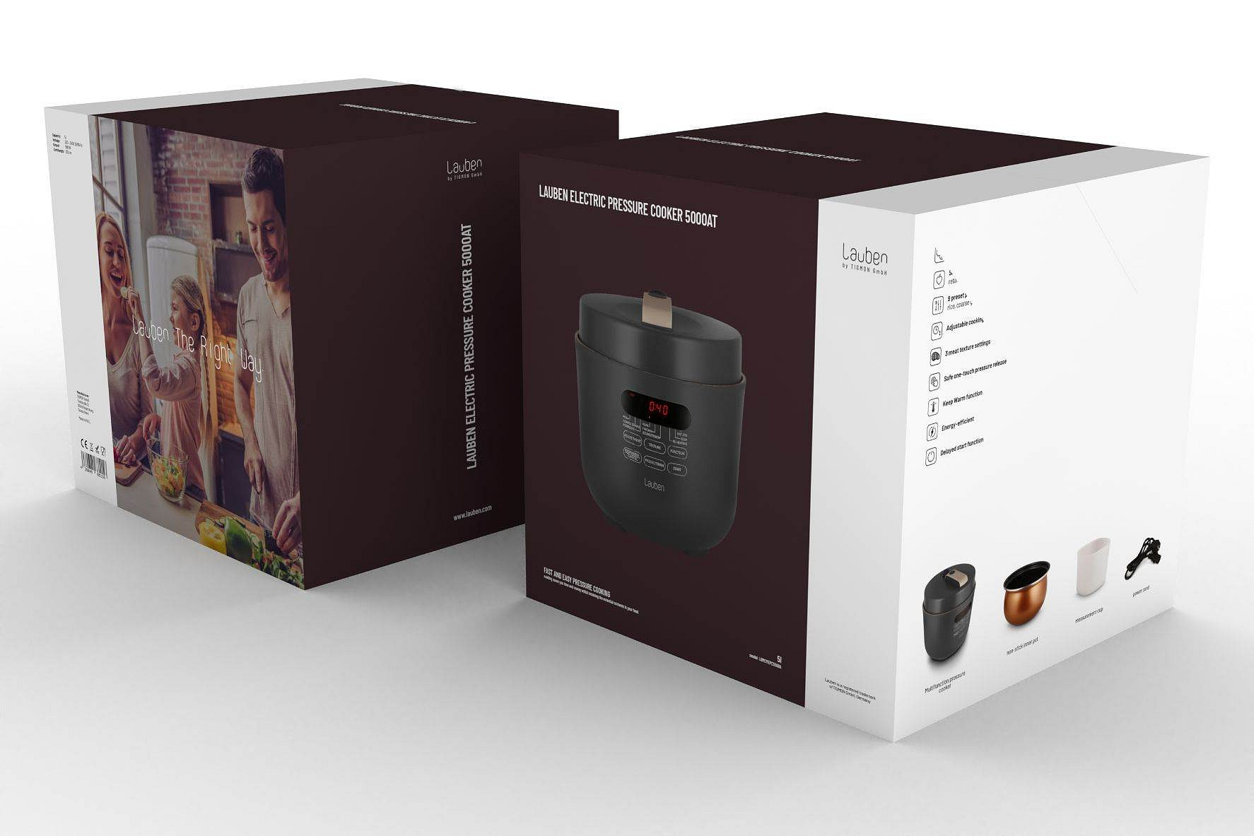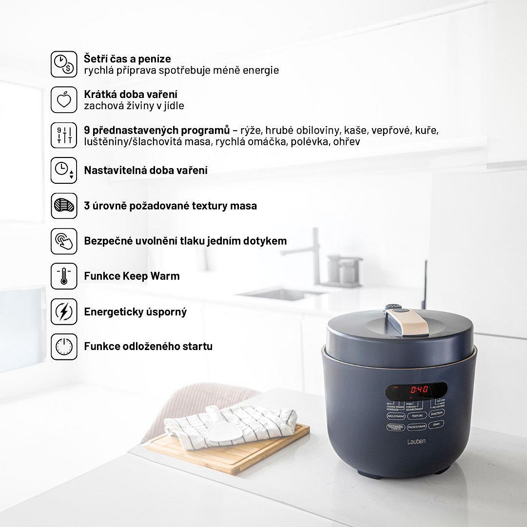 Víceúčelový a energeticky úsporný elektrický tlakový hrnec Lauben Electric Pressure Cooker 5000AT umí díky tlaku uvnitř připravit chutné pokrmy za rekordně krátkou dobu. Čas, který ušetříte, tak můžete věnovat sobě či rodině. Zároveň uspoříte i peníze, neboť spotřeba energie je při tomto způsobu vaření nižší. Kratší příprava prospívá také surovinám, které si uchovávají více živin. Stačí přitom jediné, vložit vše potřebné do hrnce, zavřít, zapnout a o vše ostatní se již přístroj postará sám.