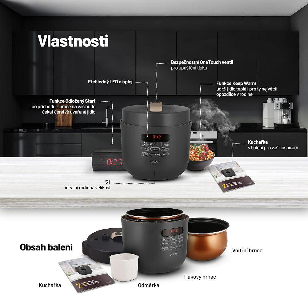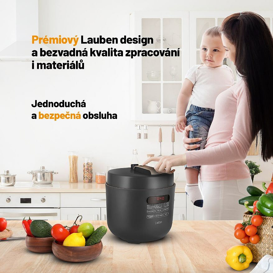 Dostaňte pod tlak jídlo, ne sebeTlakové hrnce bývaly vždy vítanými, avšak obávanými společníky v domácnosti. Energeticky úsporný víceúčelový elektrický tlakový hrnec Lauben Electric Pressure Cooker 5000AT má všechny výhody tzv. papiňáku a ještě víc, jen v moderním a bezpečném hávu. Čas i peníze šetří kratší dobou přípravy díky tlaku uvnitř, navíc takto se zachová v jídle více živin. I když nejste kuchařský mistr, oblíbíte si fakt, že do hrnce stačí dát suroviny, zapnout a on se už postará. Hrnec disponuje 9 přednastavenými programy a 3 úrovněmi požadované struktury masa. Čas přípravy ovlivníte i manuálně. 5l objem stačí pro celou rodinu, údržba je snadná, bezpečnost zajišťuje One Touch ventil pro upuštění tlaku. Jídlo udrží teplé funkce Keep Warm, lepší plánování umožní odložený start. Balení obsahuje též kuchařku.