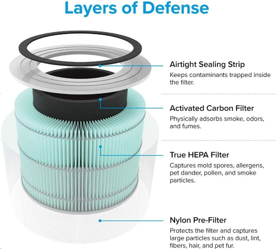 Druhou vrstvou je HEPA filtr H13. To odlišuje Levoit od konkurence, protože filtr HEPA H13 je mnohem kvalitnější a spolehlivější než běžně používané HEPA H11. Tu se odfiltrují jemné prachové částice, plíseň, bakterie, pyl, kouřové částice, roztoče a srst.