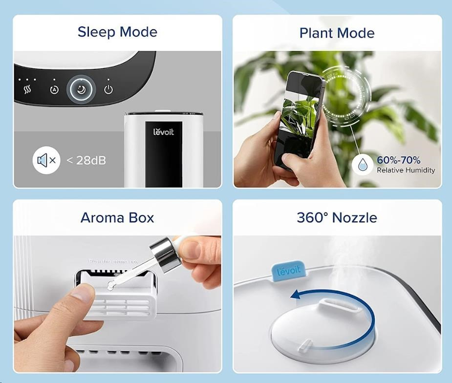 Provoz je velice tichý a nebude vás rušit ani při spaní. Budete moci nerušeně snít a zvlhčovač Levoit OasisMist Smart se postará o kvalitu a vlhkost vzduchu v místnosti podle vašich představ. Hlučnost v provozu je pouhých 28 dB.