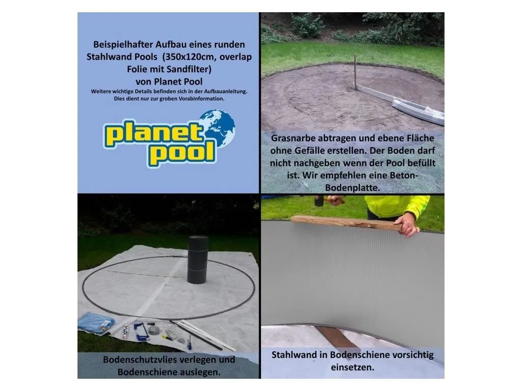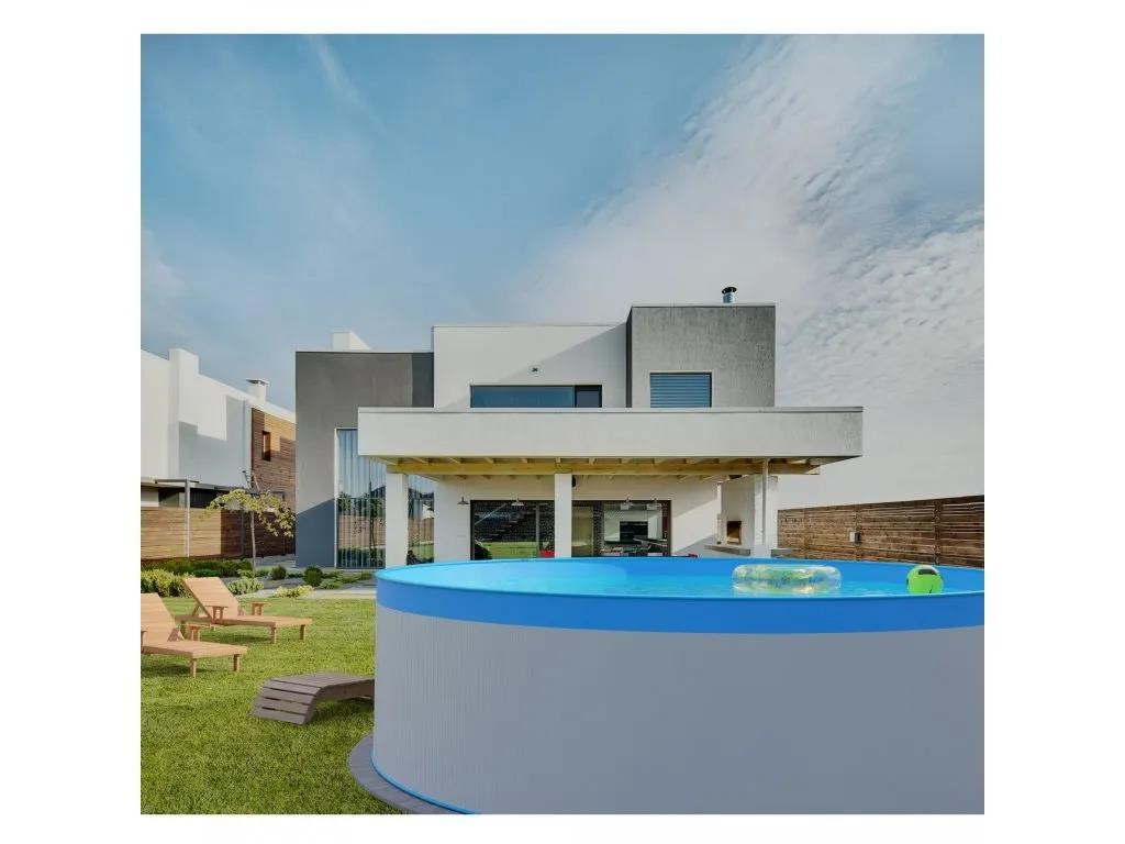 Bazén se pyšní moderním bílým nátěrem ocelové stěny, který elegantně doplňuje sytě modrá PVC závěsná fólie, UV stabilizovaná pro zajištění barevné stálosti a prodloužené životnosti. Bazén je ideální pro instalaci na rovném a stabilním podkladu s dostatečným odstupem od potenciálního spadu nečistot ze stromů a střech. Instalace je jednoduchá, pomocí spodních a horních plastových lišt, do kterých se zasazuje ocelová stěna. Obě strany stěny se následně propojí pomocí vnitřních a vnějších lišt a šroubů. Mrazuvzdorná fólie se zavěsí za horní okraj ocelové stěny a přesně se vytvaruje do bazénu. Fólie je flexibilní a vyrobena na míru, takže nevyžaduje žádné další úpravy. Pro podrobný návod k montáži krok za krokem následujte pokyny v přiloženém montážním manuálu. Tento bazén představuje osvědčenou a historicky prověřenou koncepci pro spolehlivý a bezstarostný zážitek z koupání.