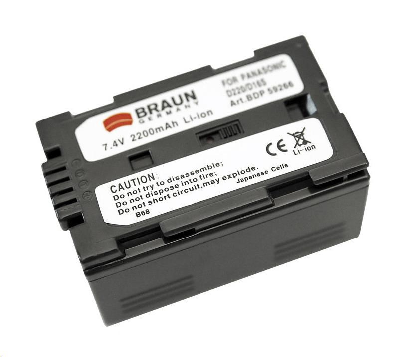 Li-Ion akumulátor Braun BDP-PD220 (M, PANASONIC D220, 14, 16 - 7,4 V/2200 mAh) pro digitální videokamery PANASONIC HC-X1000, NV D16, D89, DA1, DS3, DS8, DS11, DS12, DS15, DS25, DS27, DS28, DS29, DS30, DS33, DS35, DS37, DS38, DS50, DS55, DS60, DS65, DS68, DS77, DS88, DS99, DS150, DS990, EX1, EX3, EX21, GS1, GS2, GS3, GS5, GS11, GS15, GX7, MD9000, MX1, MX2, MX5, MX7, MX8, MX300, MX340, MX350, MX500 a HDC Z10000. Tento akumulátor je dodáván v částečně nabitém stavu. Před použitím je vhodné akumulátor nabít. Plné kapacity akumulátoru může být dosaženo až po cca 4-5 nabíjecích cyklech. V případě více modelů jednoho typu akumulátoru s různou kapacitou vybírejte podle doporučení výrobce přístroje !!! Vyšší kapacita umožňuje delší dobu záznamu, ale větší rozměr (výška) akumulátoru může komplikovat nebo zcela bránit použití !!!.