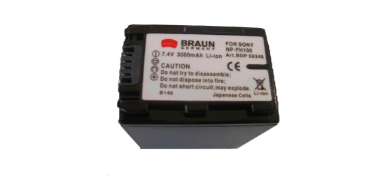 Li-lon akumulátor Braun BDP-SFH100 (22, SONY "H" NP-FH90, 100 - 7,4 V/3000 mAh) pro digitální videokamery SONY DCR DVD106, DVD109, DVD110, DVD115, DVD306, DVD310, DVD406, DVD410, DVD506, DVD510, HC37, HC45, HC47, HC51, HC53, HC62, SR32, SR35, SR36, SR52, SR72, SR55, SR75, SR190, SR210, SR290, HDR CX6, HC5, HC7, HC9, SR5, SR7, SR8, SR10, SR11, SR12, UX3, UX7, UX9, UX19. Tento akumulátor je dodáván v částečně nabitém stavu. Před použitím je vhodné akumulátor nabít. Plné kapacity akumulátoru může být dosaženo až po cca 4-5 nabíjecích cyklech. V případě více modelů jednoho typu akumulátoru s různou kapacitou vybírejte podle doporučení výrobce přístroje !!! Vyšší kapacita umožňuje delší dobu záznamu, ale větší rozměr (výška) akumulátoru může komplikovat nebo zcela bránit použití !!!.