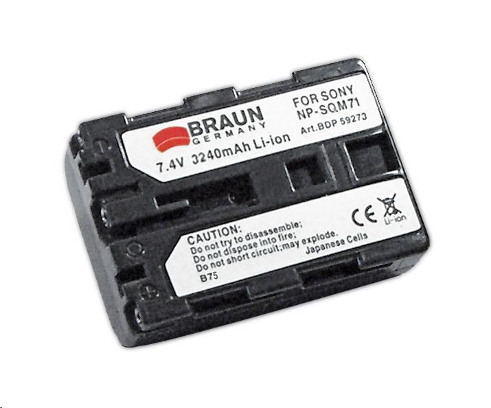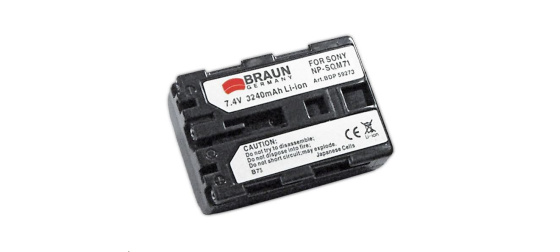 Li-lon akumulátor Braun BDP-SQM71 (T, Sony "M" NP-FM70, QM71 - 7,4 V/3240 mAh) pro digitální videokamery SONY DCR DVD91, DVD101, DVD100, DVD200, DVD201, DVD300, DVD301, HC14, HC88, PC6, PC8, PC9, PC100, PC101, PC103, PC105, PC110, PC115, PC120, PC330, TRV6, TRV8, TRV10, TRV11, TRV12, TRV14, TRV15, TRV16, TRV17, TRV18, TRV19, TRV20, TRV22, TRV24, TRV25, TRV27, TRV30, TRV33, TRV40, TRV50, TRV60, TRV80, TRV140, TRV145, TV218, TRV230, TRV238, TRV239, TRV240, TRV245, TRV250, TRV255, TRV260, TRV265, TRV270, TRV280, TRV285, TRV325, TRV330, TRV340, TRV345, TRV355, TRV350, TRV360, TRV418, TRV428, TRV460, TRV480, TRV530, TRV725, TRV730, TRV738, TRV740, TRV828, TRV830, TRV840, TRV940, TRV950, HDR HC1, SR1. Tento akumulátor je dodáván v částečně nabitém stavu. Před použitím je vhodné akumulátor nabít. Plné kapacity akumulátoru může být dosaženo až po cca 4-5 nabíjecích cyklech. V případě více modelů jednoho typu akumulátoru s různou kapacitou vybírejte podle doporučení výrobce přístroje !!! Vyšší kapacita umožňuje delší dobu záznamu, ale větší rozměr (výška) akumulátoru může komplikovat nebo zcela bránit použití !!!.
